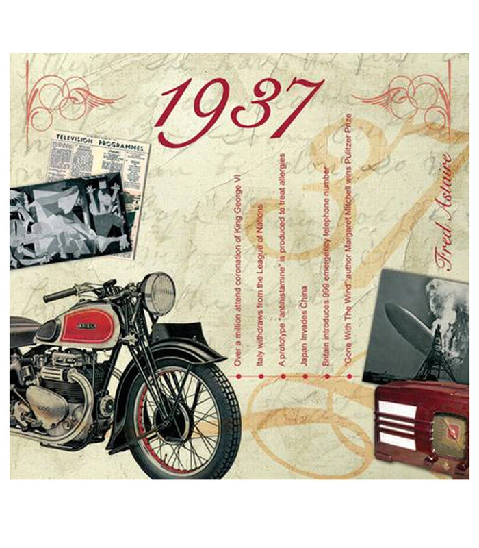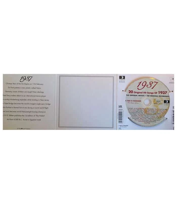 This unique, deluxe greeting card features fabulous iconic imagery along with news headlines and facts from 1937. The two-fold card, together with the included 20-track compact disc featuring many of 1937’s top artists and biggest hits, evokes a real sense of the year.