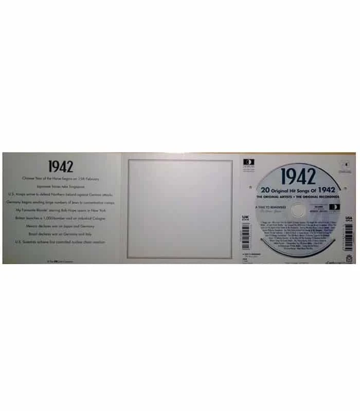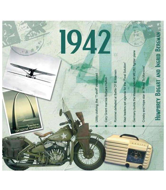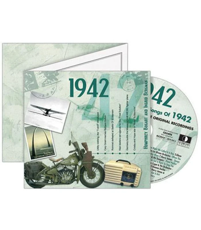 This unique, deluxe greeting card features fabulous iconic imagery along with news headlines and facts from 1942. The two-fold card, together with the included 20-track compact disc featuring many of 1942ās top artists and biggest hits, evokes a real sense of the year.