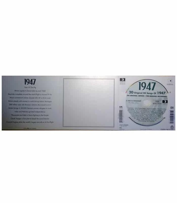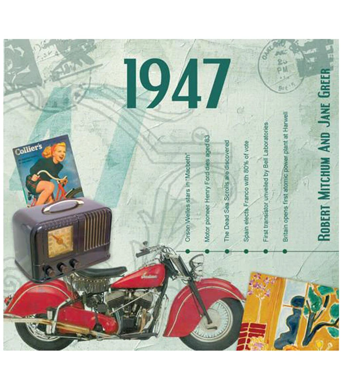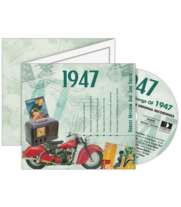 This unique, deluxe greeting card features fabulous iconic imagery along with news headlines and facts from 1947. The two-fold card, together with the included 20-track compact disc featuring many of 1947’s top artists and biggest hits, evokes a real sense of the year.