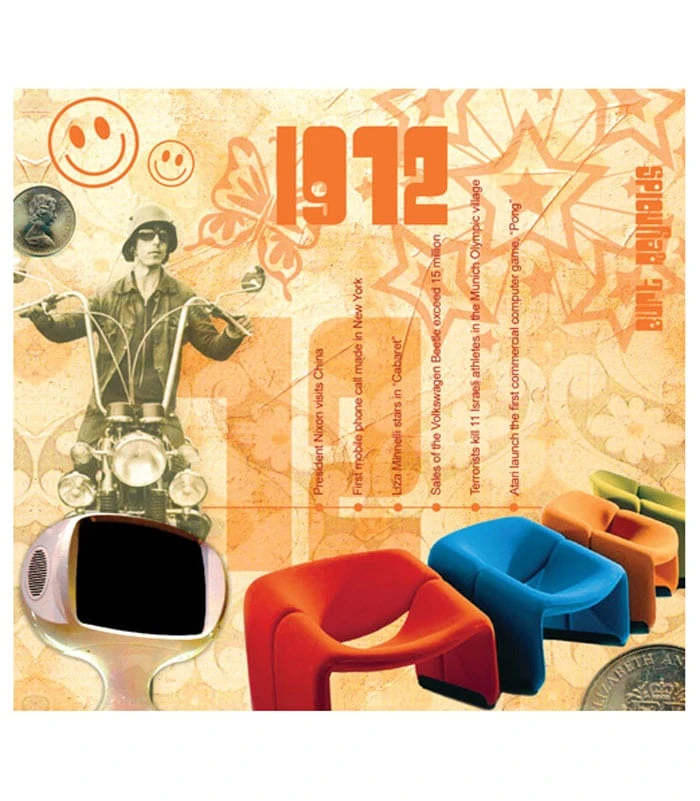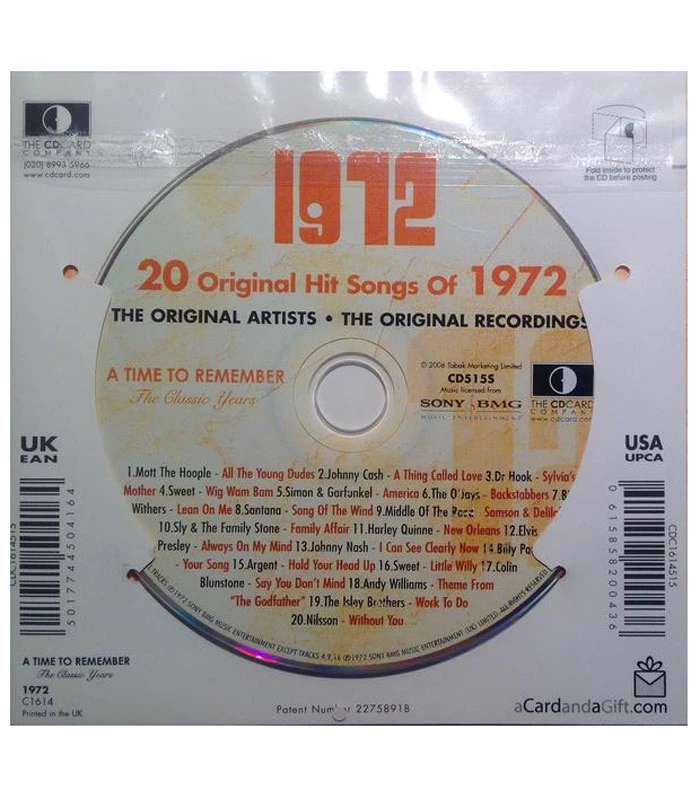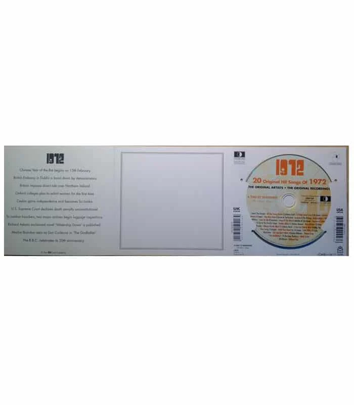 This unique, deluxe greeting card features fabulous iconic imagery along with news headlines and facts from 1972. The two-fold card, together with the included 20-track compact disc featuring many of 1972ās top artists and biggest hits, evokes a real sense of the year.