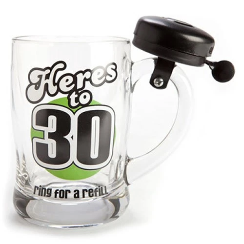 30th Birthday Beer Mug with Bell – “Here’s to 30 Ring for a Refill”