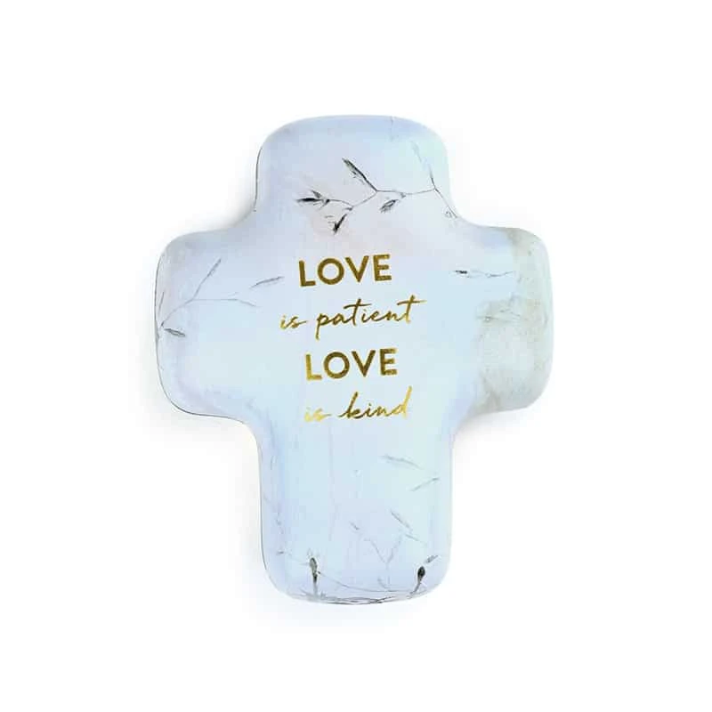 Artful Cross Keepers Love Is. A faith-filled wedding wish, this Artful Cross Keeper is perfect for any occasion involving a loving couple. Furthering the tradition of treasuring our faith, these artful boxes decoratively house nostalgic keepsakes or spiritual mementos. Inspired designs prove itβs not the size of the gift that matters, itβs the power of the meaning held inside. Featuring a minimalistic light-blue background with gold text, the sentiment reads, βLove is patient, Love is kind.β This uplifting, artful sculpture piece is great for holding keepsakes that remind us of special relationships.