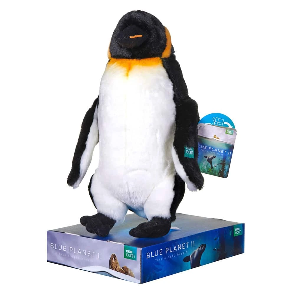 This Super soft Penguin cuddly plush toy from the BBC Blue Planet Range sits on a cardboard plinth and is made to last. The toy can be removed from the plinth if preferred. The toy features a QR code which will take you to the trailer.