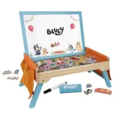Inspire your little one’s imagination with this Bluey Creation Station! Get creative with Bluey and her friends. Colouring and drawing are examples of what your Bluey loving little one will spend hours enjoying. With 100 magnets, children can create their own Bluey scenes with their favourite characters. With a removable whiteboard lid, children can draw on the 4 activity sheets included. Not only this but the tray’s folding legs accommodate them on the go, whether it’s for entertainment on a long journey or to use in their bedroom. The canvas pockets are also handy to store all the magnets away. The Bluey creation station is made from responsibly sourced materials and are certified by the FSC. Suitable for ages 3 years +.
