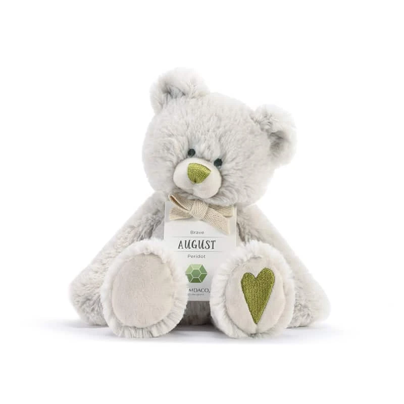 Demdaco Birthstone Bear – August Brave Peridot. The August Birthstone Bear is the perfect simple, lovable way to celebrate the birth of a new little one and the month in which they were born. This cuddly bear features a ribbon that symbolizes the month of August along with heartfelt sentiments that encourage excitement and celebration, reading, “Brave.” A part of the Birthstone Bears Collection, this cute plush bear is the perfect thoughtful companion for any young child or new little one arriving this season. Perfect for gifting to any new baby, as a first birthday present or for a baby shower.
