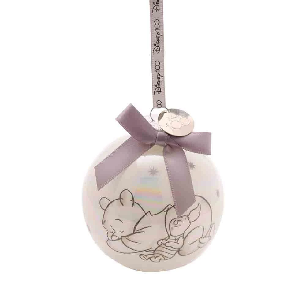 Set includes 4 iridescent Disney love-themed baubles in a gift box. Baubles have all over decal prints of Mickey & Minnie, Pooh & Piglet, Dumbo and Simba & Nala. Each bauble is finished with a Disney 100 branded ribbon hanger and tied with a bow, and features a silver metal disk embossed with the Disney 100 logo.