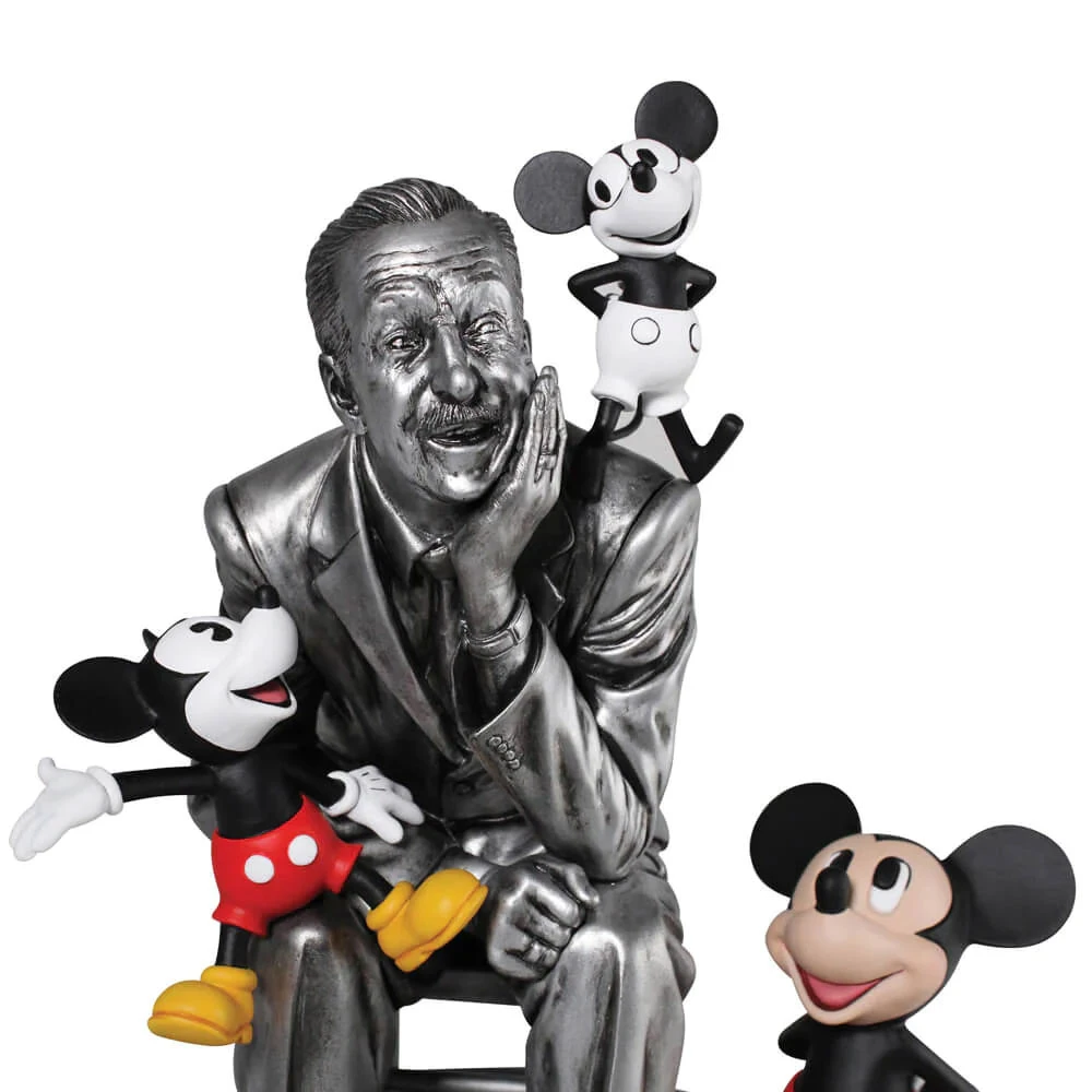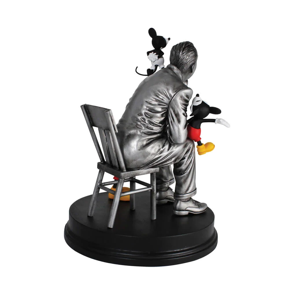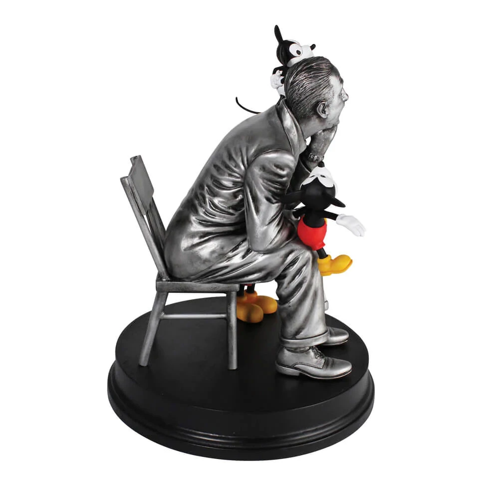 Carefully crafted from stone resin, zinc alloy and polyresin, this remarkable piece features three versions of Mickey Mouse: Original Mickey (Steamboat Willie), Pie Eye Mickey and Modern Mickey, interacting with a platinum look Walt Disney sitting upon a chair with his hand resting under his chin.