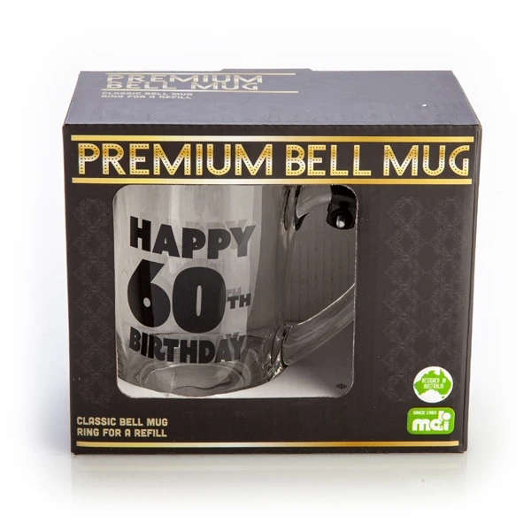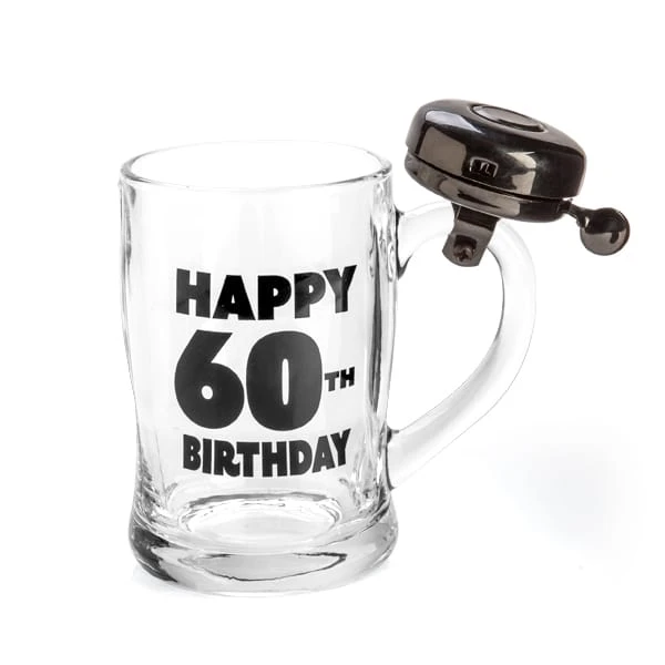 Design(s): Glass beer mug with a black bell attached to the handle, features “Happy 60th Birthday” in bold black lettering