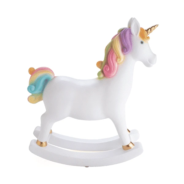 - Unicorn rocking horse table lamp, with bright golden horn, battery-operated for maximum portability